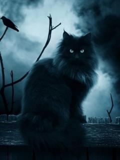Очень интересная и прикольная аватарка на ваш телефон - прекрасная, пушистая кошечка цвета вечерних сумерек, где в далеке сидит ворон, и пейзаж буд-то родственник кошки Отличная аватарка для социальных сетей Вконтакте (VK) и Одноклассников!