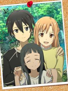Кавайная фотография в рамочке на которой вы увидете главных героев из аниме сериала sword online. На ней изображены Кирито, Асуна и их так называемая дочка. Отличная аватарка для социальных сетей Вконтакте (VK) и Одноклассников!